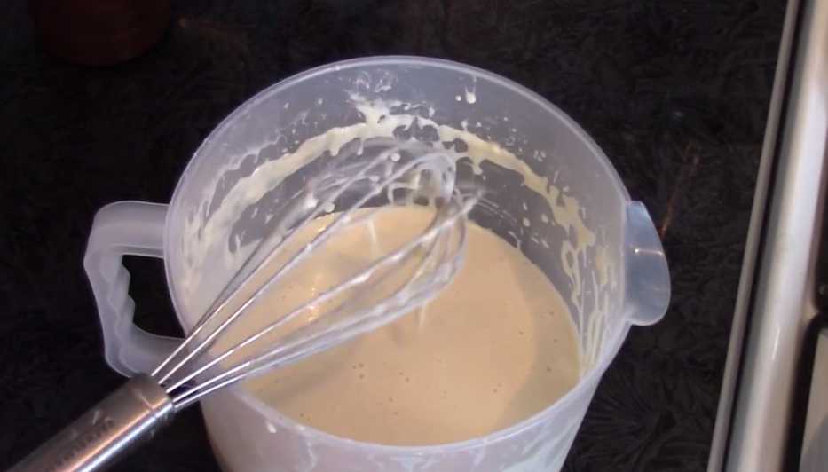 Постепенно жидкую смесь подливаем в муку и замешиваем тесто. Хорошо прорабатываем его венчиком, чтобы не было комочков.