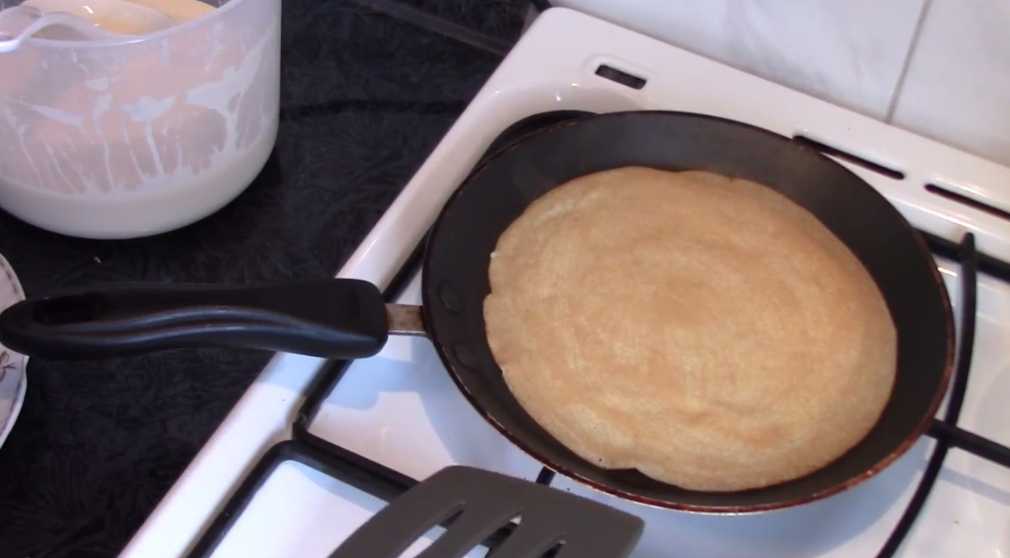 Когда края блина станут сухими и начнут появляться пузыри на поверхности теста, это займет около 2 минут, аккуратно переворачиваем кулинарным шпателем или ножом с широким лезвием. Готовим еще 1-2 минуты или пока не подрумянится в середине.