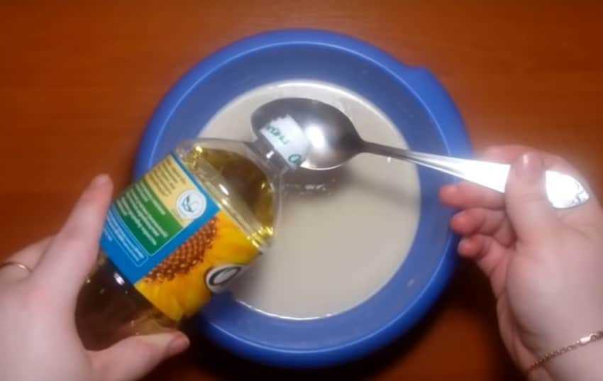 3. Теперь подливаем сюда кипяток и сразу же вмешиваем его в массу. Добавляем растительное масло и вновь перемешиваем.