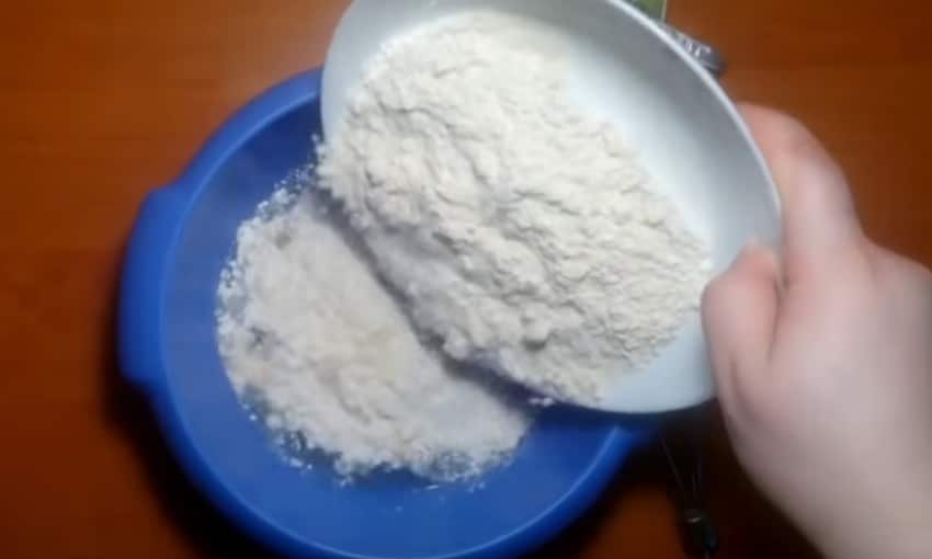 - Просейте в миску 300 граммов белой муки и убедитесь, что ваше тесто получилось таким же густым, как сметана.