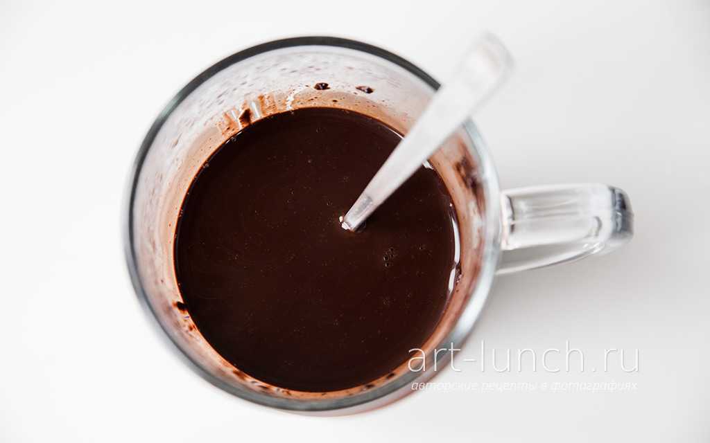 Теперь необходимо добавить заваренное ранее какао. Здесь нужно быть очень внимательным, какао должно остыть, его температура не должна превышать 35°С. Если какао будет горячим, то масло в тесте растает, тесто станет жидким, не поднимется и не пропечётся. Итак, добавляем в тесто какао и перемешиваем 1-2 минуты до однородного состояния (лучше миксером на низкой скорости).