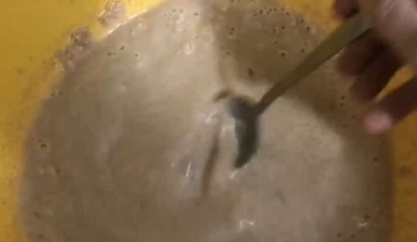 - Спустя указанное время, достаньте тесто. На его поверхности должны были образоваться пузырьки, если их нет – значит, вы неправильно выбрали место, для хранения теста. На данном этапе это не критично, просто переставьте миску в более теплое место.
