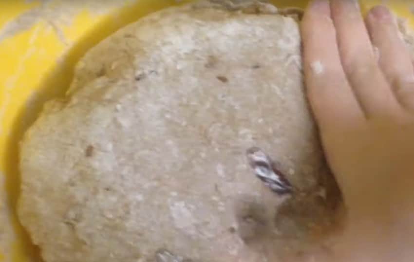 - Размешайте ингредиенты ложкой, затем вымешайте руками. В итоге тесто должно быть мягким и эластичным.