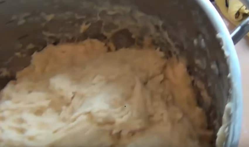 - Всыпать муку и перемешать получившийся состав до исчезновения комочков муки.