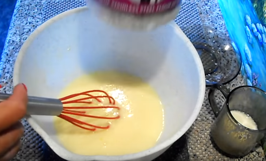 Шаг 1. Необходимо в глубокой миске смешать курные яйца, соль, сахар и молоко. Все необходимо очень тщательно размешать, до получения однородной консистенции. Необходимо следить за крупинками сахара – они должны полностью растаять.