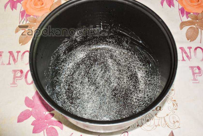 9. Чашу мультиварки смазываем сливочным маслом и посыпаем манкой либо панировачными сухарями. Можно и пергаментом дно застелить, хотя запеканка отлично отстаёт от стенок и достаётся без проблем.