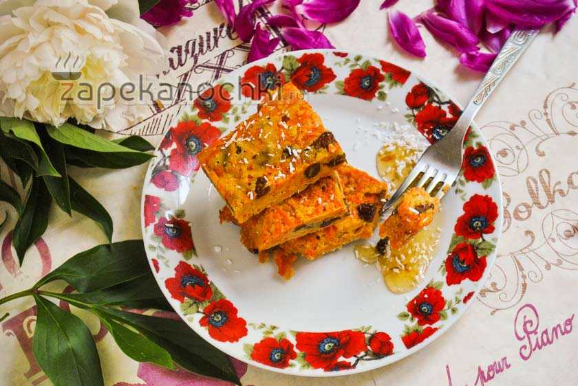 Запеканку хорошо сдобрить аппетитной медовой морковью: тонкие морковные кружочки припустите в сливочном масле с медом около 60 секунд. Далее в сотейник добавьте лимонный сок, чуточку оливкового масла и снимайте с огня. Украшение и сладкий соус к запеканке готовы!