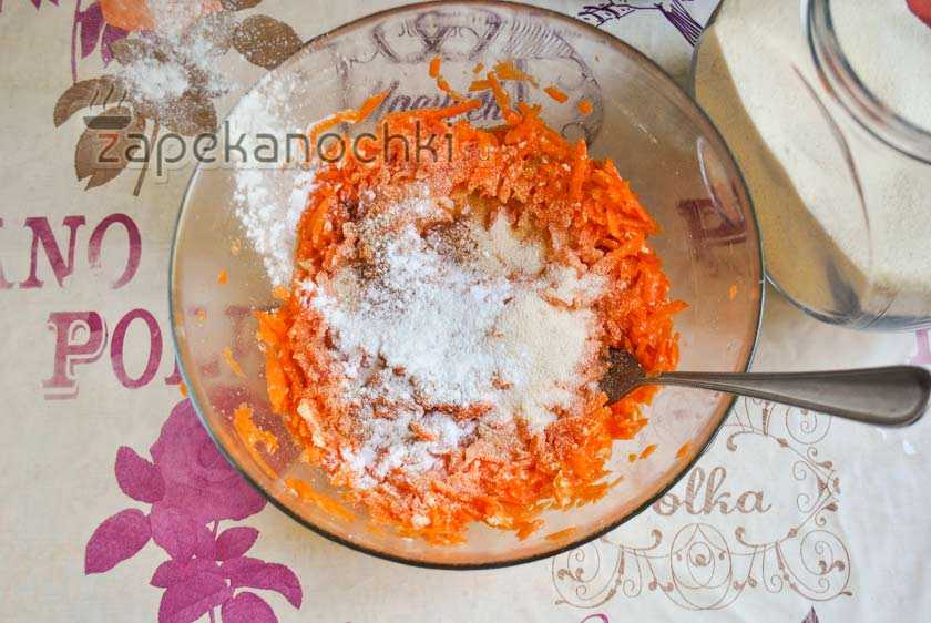 - Взбитые яйца, яблоки, манну, растительное масло добавляем, разрыхлитель, корицу добавляем в потертую морковь.