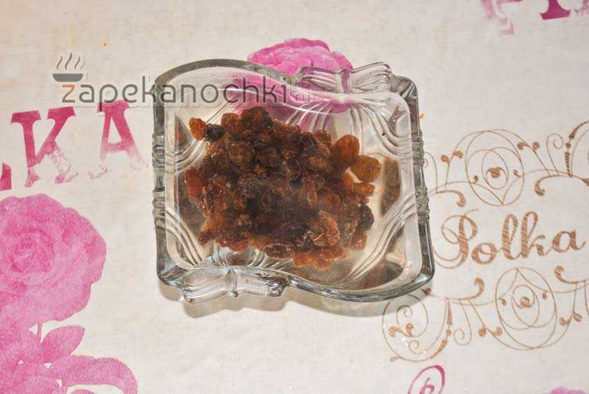 1. Изюм замачиваем в горячей воде. Заливаем не кипятком, иначе он рискует превратиться в кашу, а не набухнуть.