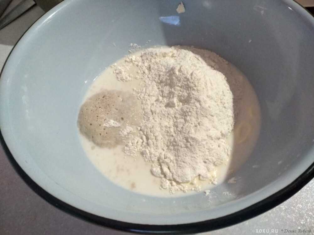 Далее всыпаем небольшими порциями муку и приступаем к замесу. Учтите, что муку перед использованием необходимо будет просеять. Таким образом мы избавимся от различных примесей, которые могут случайно попасть в продукт. И плюс насытим её кислородом, благодаря чему выпечка получится ещё вкуснее.
