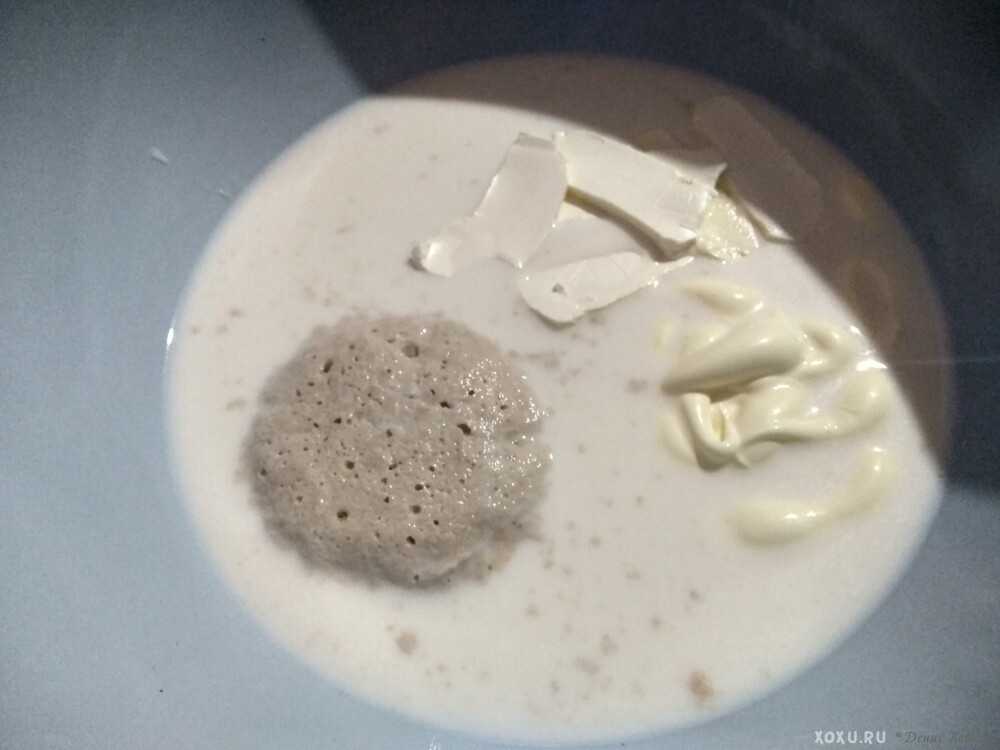 Для замеса теста, советую Вам сразу же взять глубокую чашу. Влейте в неё оставшуюся часть молока (теплого), следом выкладываем размягченное масло и майонез.
