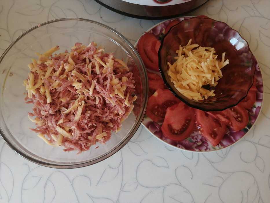 Колбасу и сыр натираем на крупной терке (важно оставить немного сыра для верхнего оформления пиццы). Помидоры нарезаем на кружочки и потом делим еще пополам