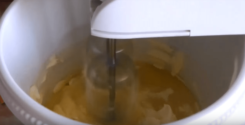 2. Продолжая взбивать, добавляем размягченное сливочное масло. Перемешиваем его еще минуту, пока не получится однородная смесь.