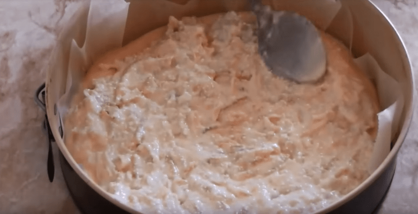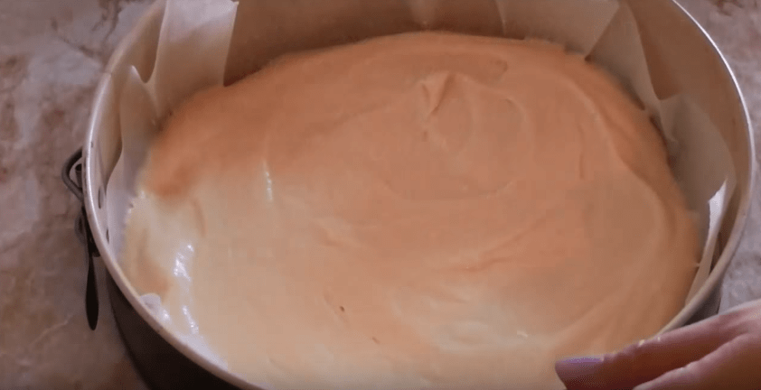 7. Тесто и начинка готовы, осталось собрать пирог. Для этого выливаем и равномерно распределяем по заранее смазанной или покрытой пергаментной бумагой форме половину приготовленного теста.