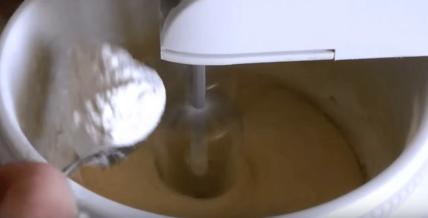 4. Просеянную муку смешиваем с разрыхлителем и ванилином и начинаем добавлять ее в миску, переключив миксер на медленные обороты.