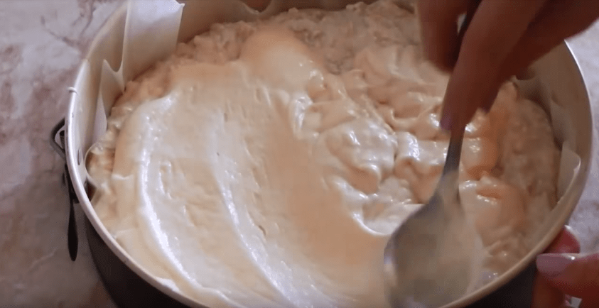 - Промаслить форму и выложить тесто, сформировать края. Следующий уровень – творожная масса, затем яблоки.