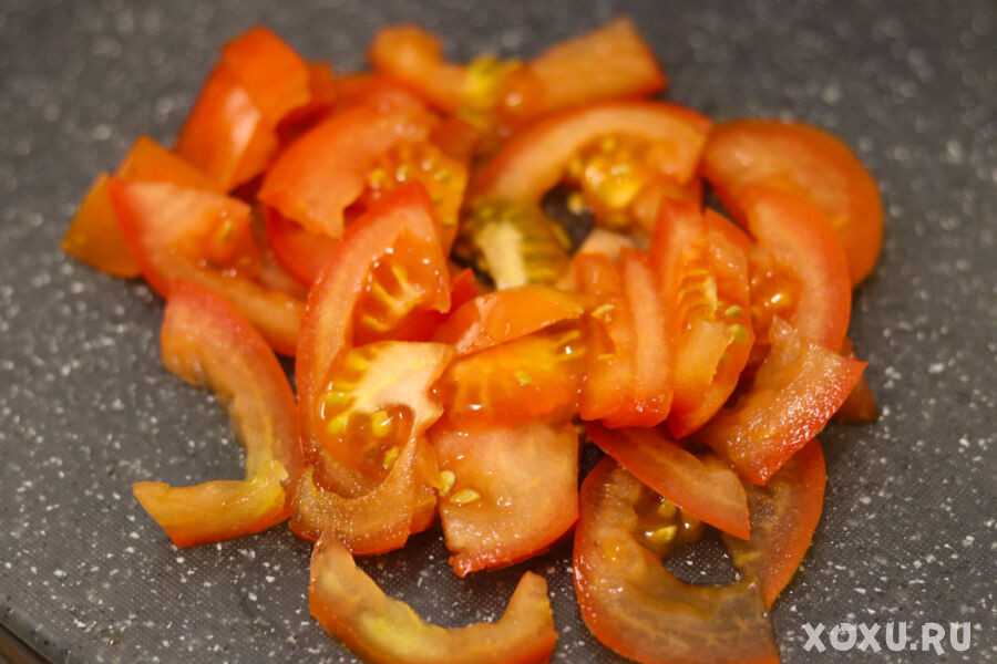 - 2 помидора. Моем и нарезаем тонкими кружочками. Они придадут сочности и нежности нашему блюду.