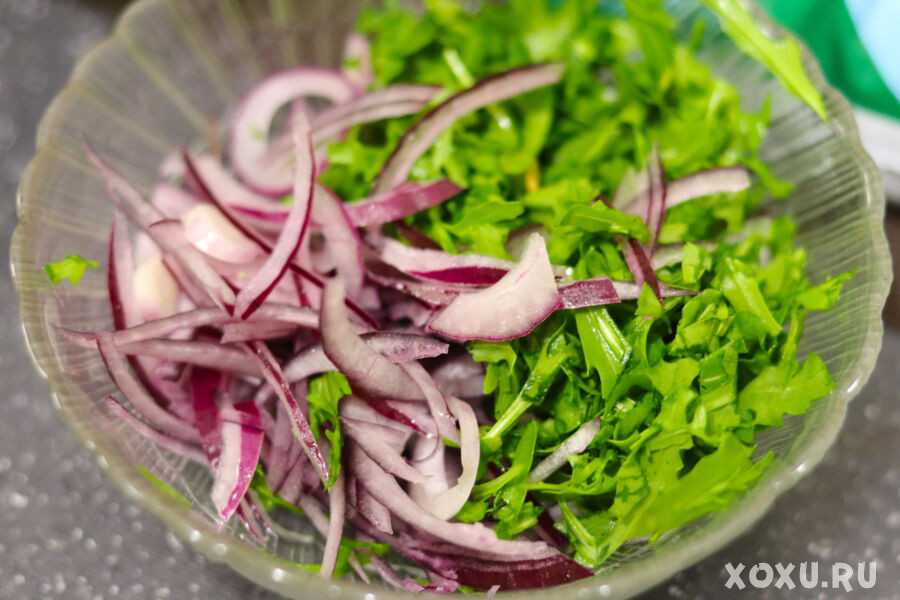 Лук полукольцами, не сильно крупно. Использую красный, он идеально подходит для этого рецепта. Пошаговое фото: