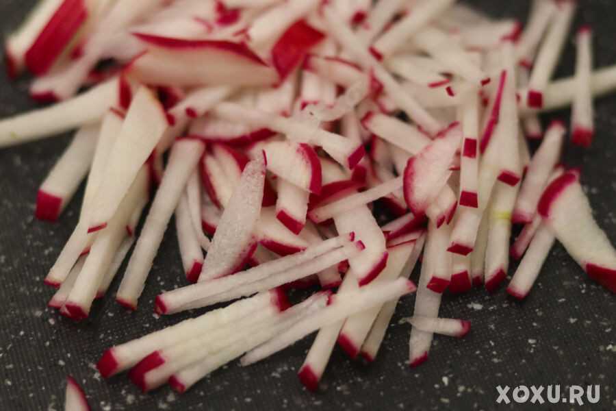 Нарезаю редис соломкой. Вы уже догадались, что этот рецепт значительно отличается от тех, которые приходилось встречать. На первый взгляд, может показаться один из ингредиентов лишним. Но поверьте — всё идеально сочетается. Смело придерживайтесь этого рецепта.