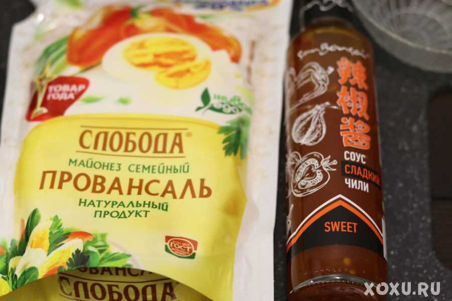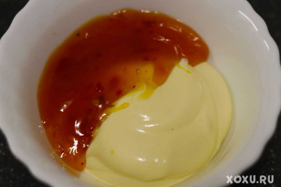 С соусом, всё проще простого! Нужен МАЙОНЕЗ и СЛАДКИЙ СОУС ЧИЛИ. Эти два ингредиента просто смешиваются в пропорциях — 2 к 1 (2 майонеза и 1 сладкий чили).