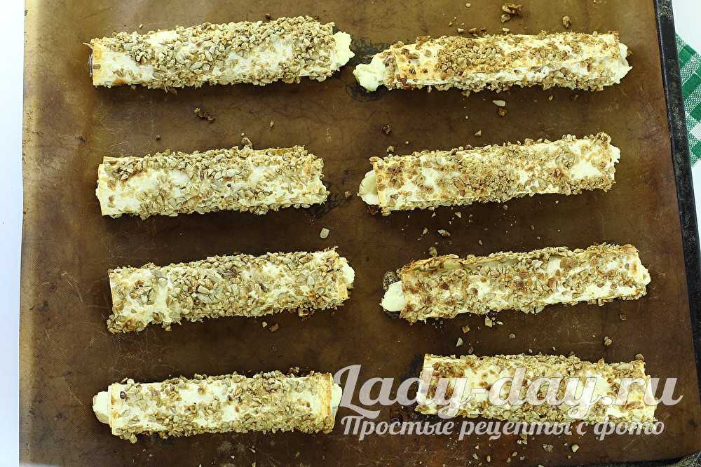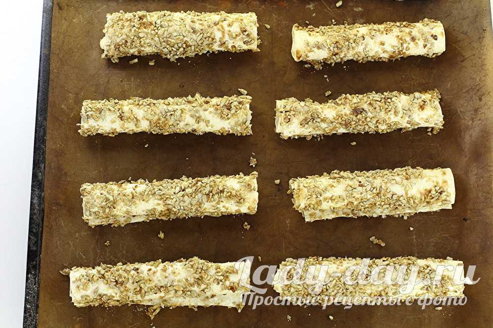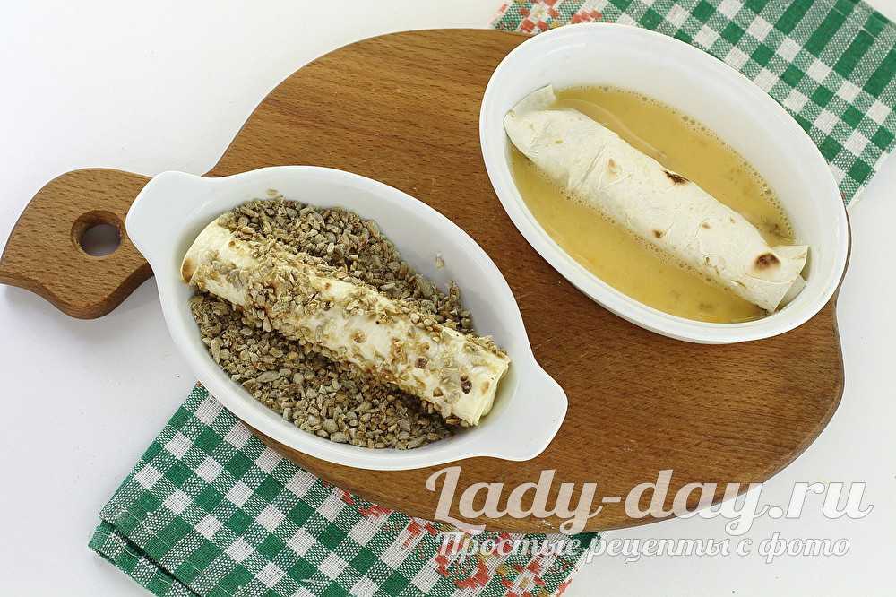Начиненную трубочку окуните во взбитые яйца, потом запанируйте в измельченных семечках.