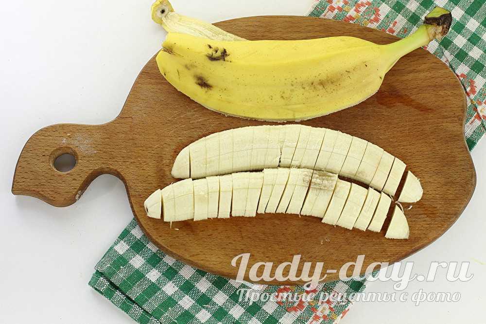 Промойте и обсушите банан. Снимите кожуру. Разрежьте вдоль по всему банану на две части. Половинки нарежьте полукольцами не очень тонкими.