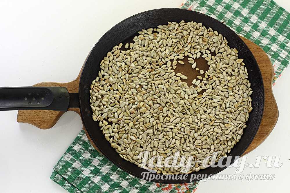 Первым делом, нужно приготовить панировку. В данном рецепте используются семена подсолнечника. Вместо них можно взять любые орехи. Раскалите сковороду на сильном огне. Насыпьте семечки. Сделайте небольшое пламя и подсушите до золотистости. Постоянно перемешивайте, чтобы семена не подгорели. Обжаренные семечки пересыпьте в чистую тарелку и остудите до комнатной температуры.
