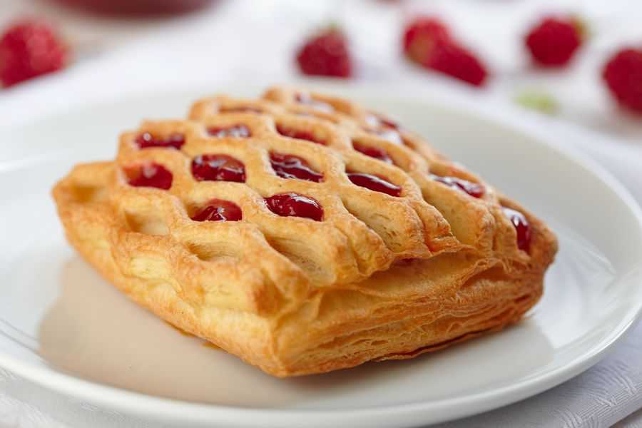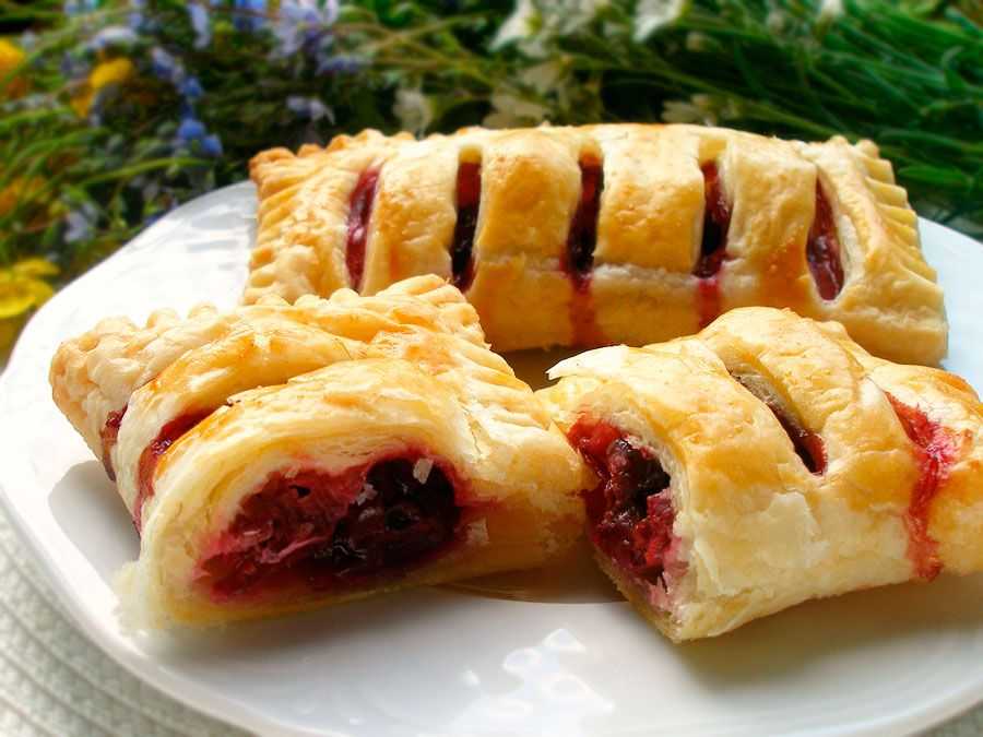 Далее раскатать тесто, нарезать квадратами. В центр каждого квадрата положить чайн. ложку крахмала, который будет впитывать в себя сок ягод и не даст слоечке расклеиться во время выпекания. Сверху положить несколько ягод, присыпать одной (можно чуть больше) чайной ложечкой сахара. В зависимости от того, какими вы хотите видеть слойки — открытые или закрытые — зависит способ склеивания слоек. Если открытые — слегка защипать между собой уголки теста, чтобы в центре слойка осталась открытой. Если закрытые — любым способом, описанным в вышеприведенных рецептах. Испечь при 180-ти град. в течение трети часа.