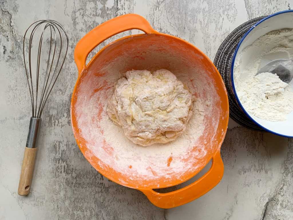 Шаг 2. Перемешайте до образования пузырьковой реакции. Просейте пшеничную муку через мелкое сито. Замесите мягкое эластичное тесто. Понадобится не менее 5-7 минут, чтобы хорошо вымесить. Приготовленное тесто должно отлежаться и отдохнуть минимум полчаса под пищевой пленкой или под чистым кухонным полотенцем.