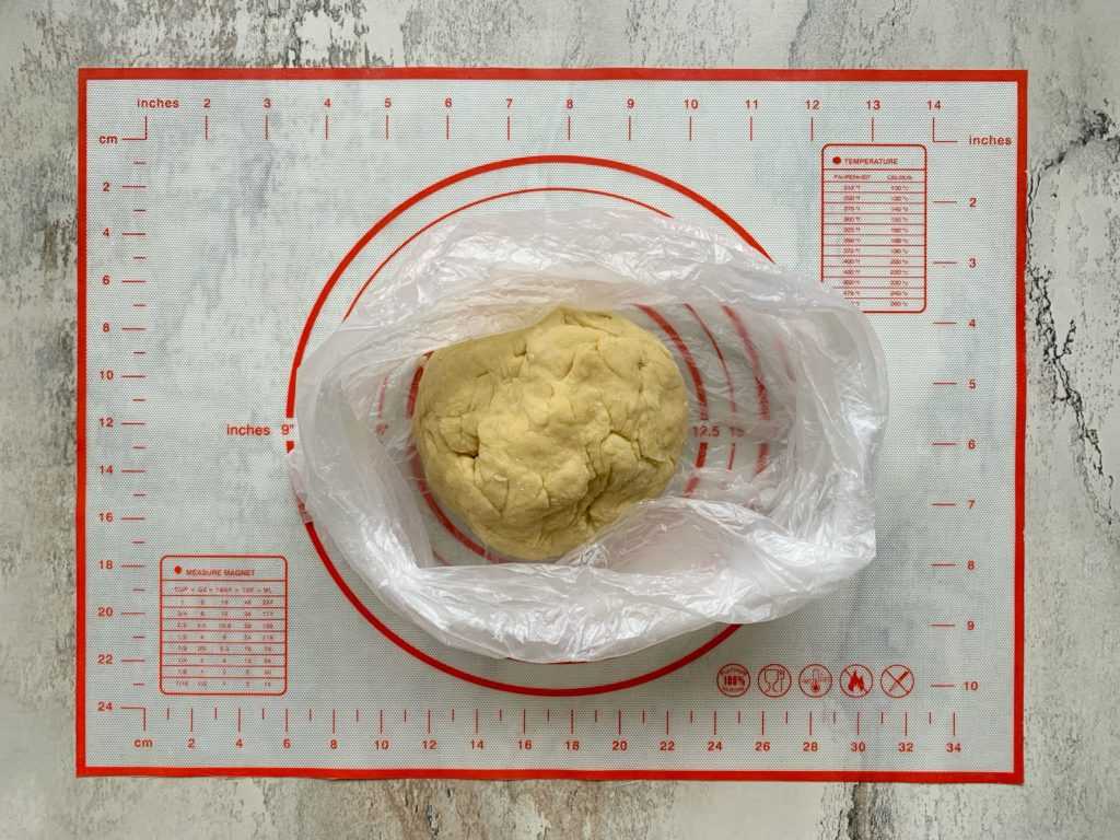 Когда тесто будет готово, переложите его в чашку, накройте пленкой и уберите чашку в холодильник на 30-40 минут. Обязательно чашку накройте, иначе тесто начнет высыхать: на его поверхности образуется со временем черствая корочка.