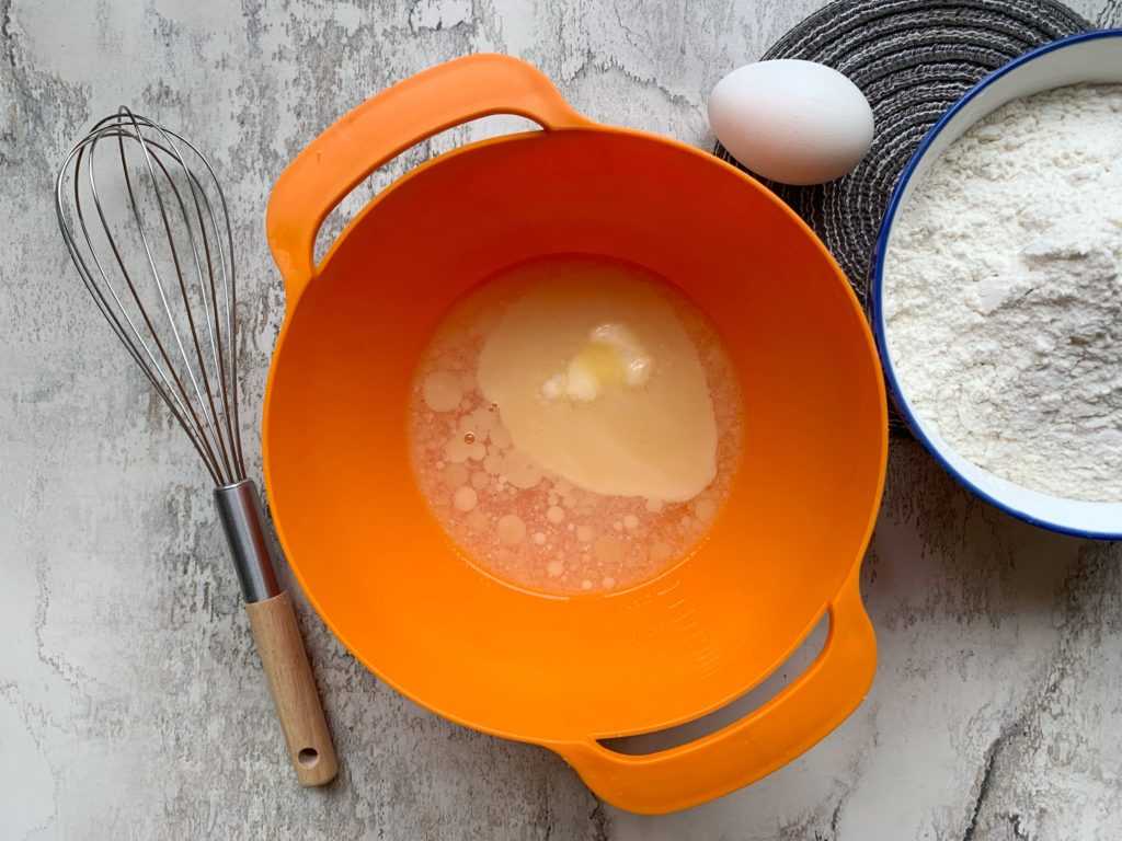 2. Сюда же добавляем часть муки и яйцо. Чтобы белок яйца не «схватился» работайте венчиком очень быстро. Вводим оставшуюся муку и переходим к замесу теста руками.