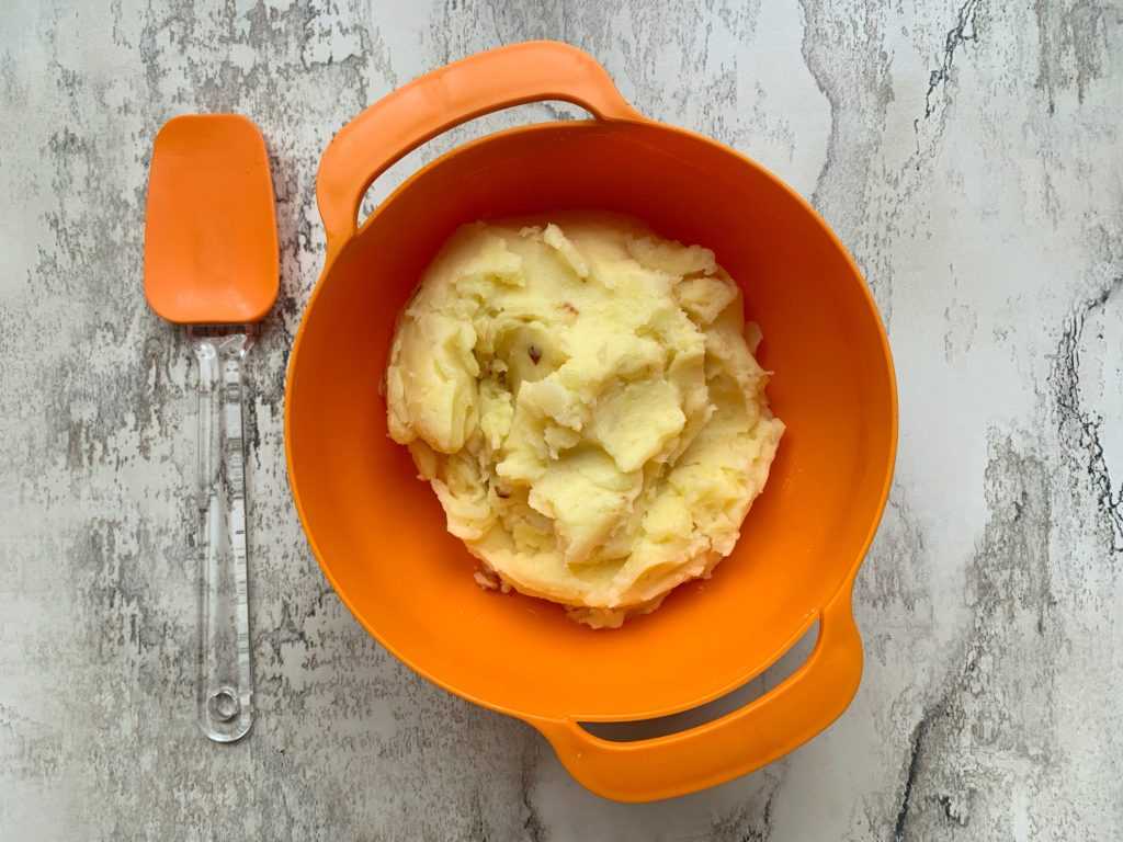За это время, картошечка уже сварилась. Сливаем с нее воду и разминаем в однородное пюре.