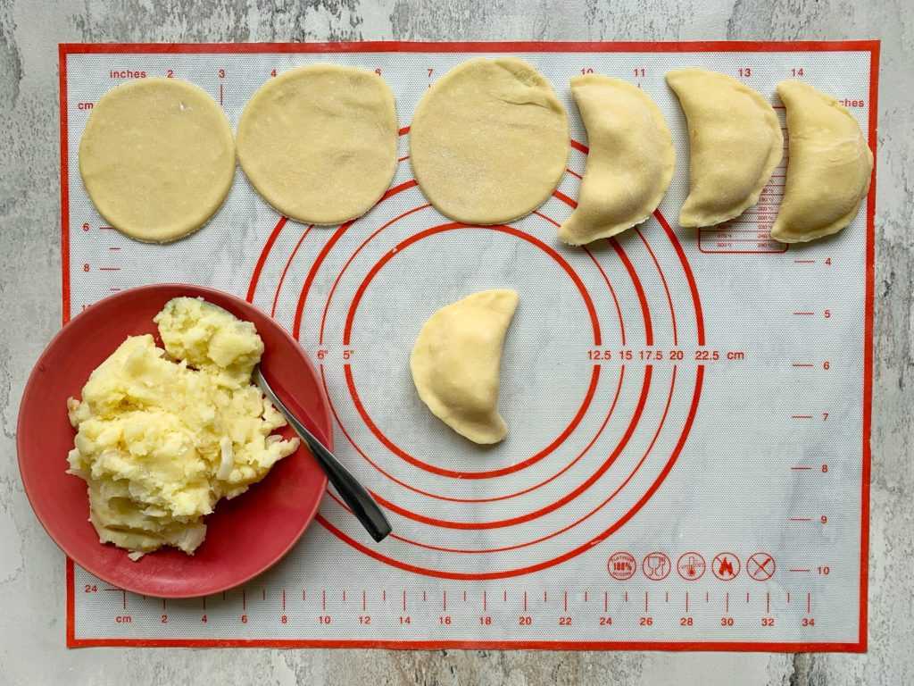 Теперь кружок сложите пополам, а края защипните плотно-плотно, чтобы вареник не развалился в процессе готовки.