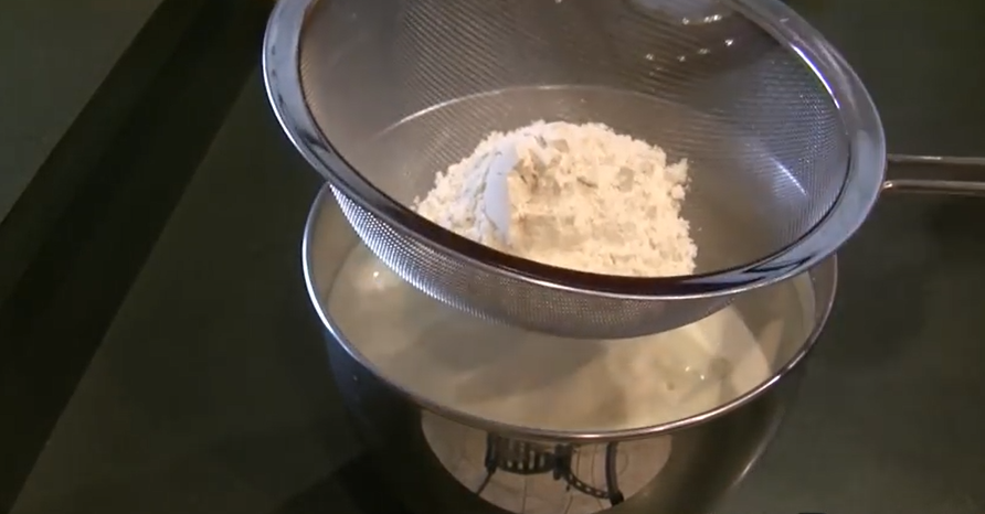 4. Теперь через ситечко в яичную массу просеиваем муку. Мука за это время обогащается кислородом и бисквит получается высоким и пышным.