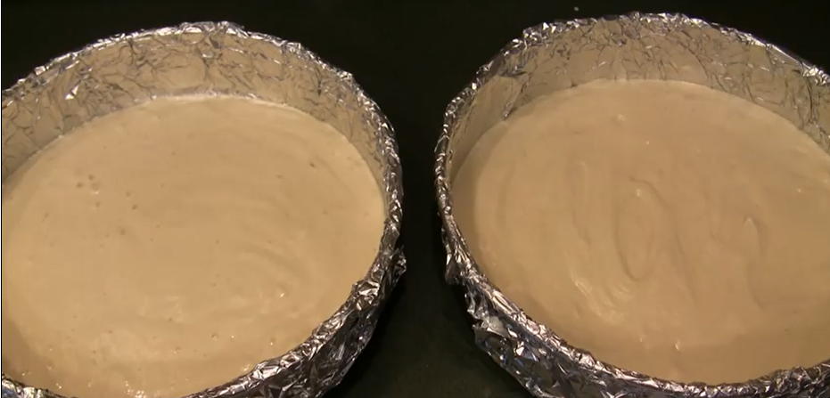 6. Выливаем полученное тесто в две формы, застеленные бумагой или фольгой и смазанные растительным маслом.