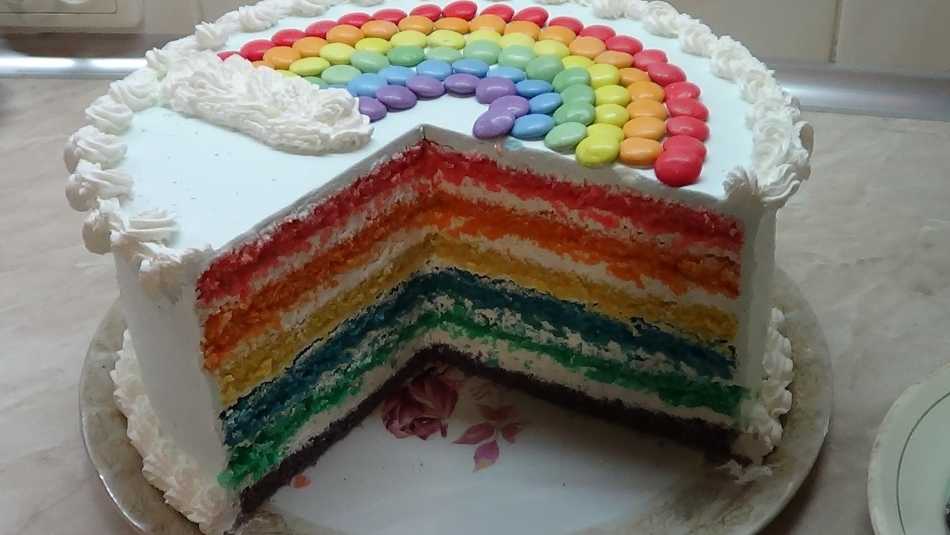 - За 3 часа тортик должен успеть застыть, и его можно будет подавать имениннику. Несомненный плюс этого лакомства в том, что оно не нуждается в дополнительном украшении: кусочки желе добавляют яркости этому тортику.
