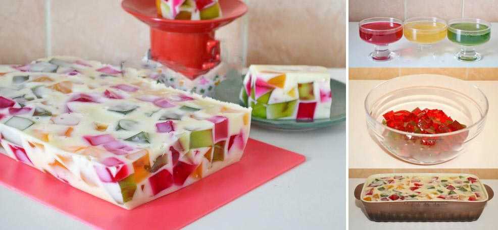 - Достаньте желе и порежьте его маленькими кубиками. Уложите их равномерно по всей форме для торта и залейте массу из сгущенки и желатина. Теперь снова отправляйте «битое стекло» в холодильник.