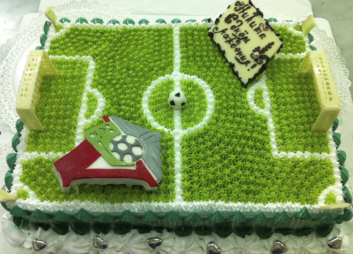 - специальная съедобная бумага, расчерченная под футбольное поле, из мастики сделать ее несколько сложнее, но можно попробовать;