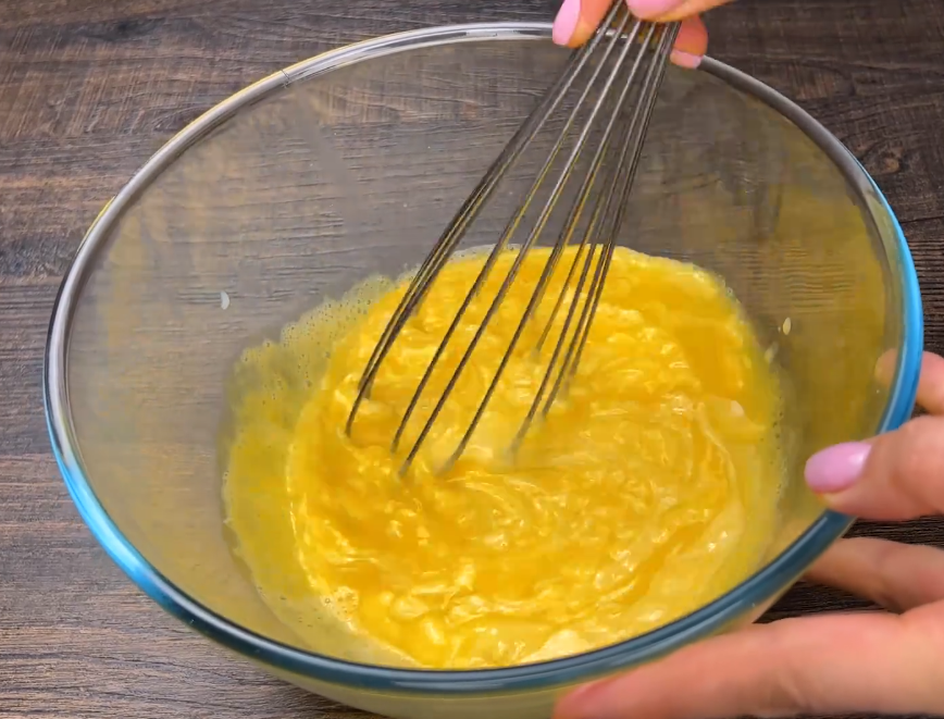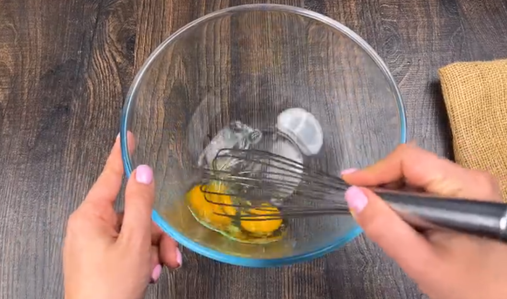 Разбив 2 яйца в подготовленную емкость, тщательно взбить.