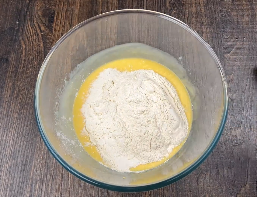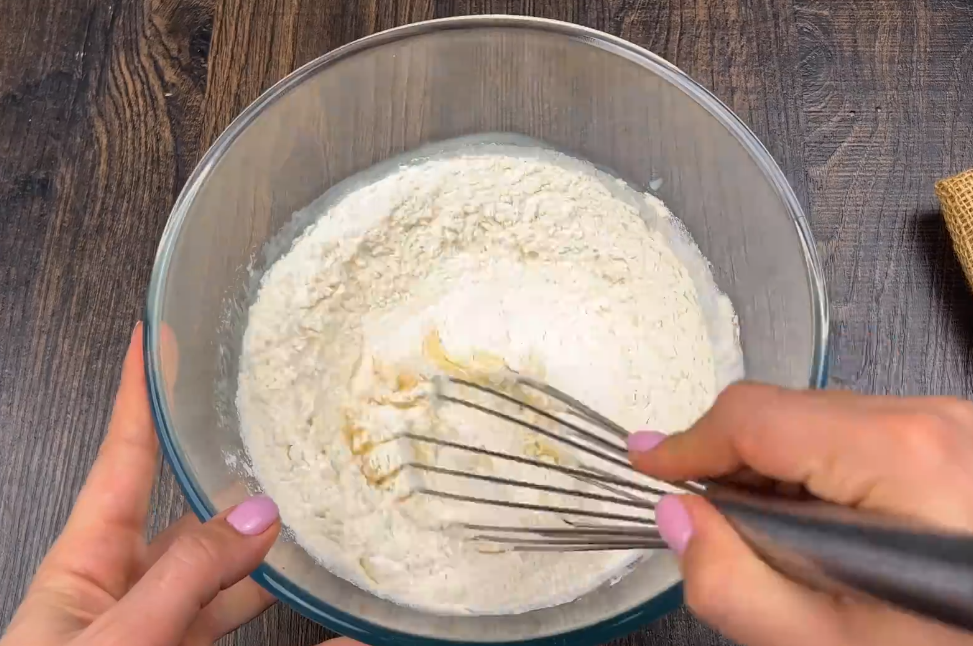 - Муку, разрыхлитель, соль — просейте, отставьте в сторонку.
