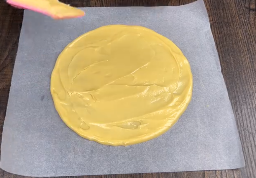 На середину круга выложить 2 полных столовых ложки подготовленного теста и начать равномерно размазывать по кругу, не выходя за края, лопаточкой, а если имеется в наличии мастихин — кондитерский (специальную лопатку), позволяющий наносить крем более равномерно, то лучше применить его.