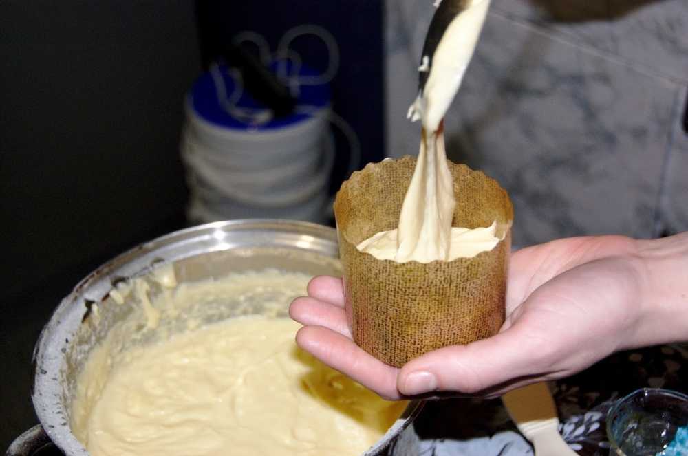 - Распределить замес в формы для куличей, смазанные растительным маслом (бумажные не смазывать). Заполнять только на 1/3.
