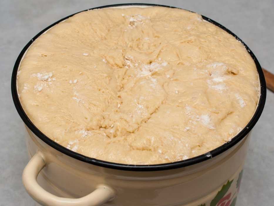 - В четверти подготовленного молока растворить 1 ст. л. песка, дрожжи, 2-3 ст. л. муки — это состав опары. Разболтать, укрыть дышащей тканью и убрать, где теплее, на 30 минут.