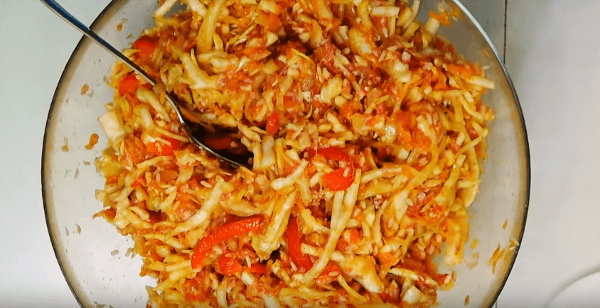 5. Капусту, овощи и рис смешиваем в одной глубокой миске.