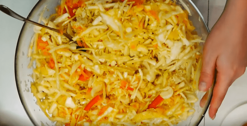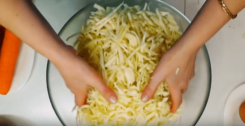 2. Капусту шинкуем и проминаем руками, чтобы она пообмякла.