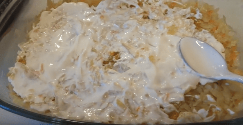 3. Готовые ингредиенты будем выкладывать слоями. На дно формы для запекания равномерно раскладываем половину приготовленной капусты (ждать остывания не надо) и сверху смазываем тонким слоем сметаны.
