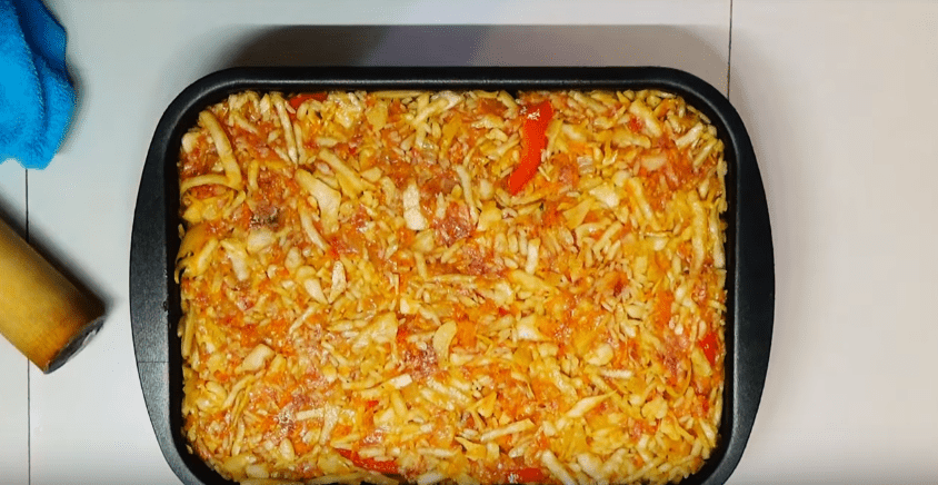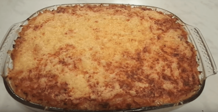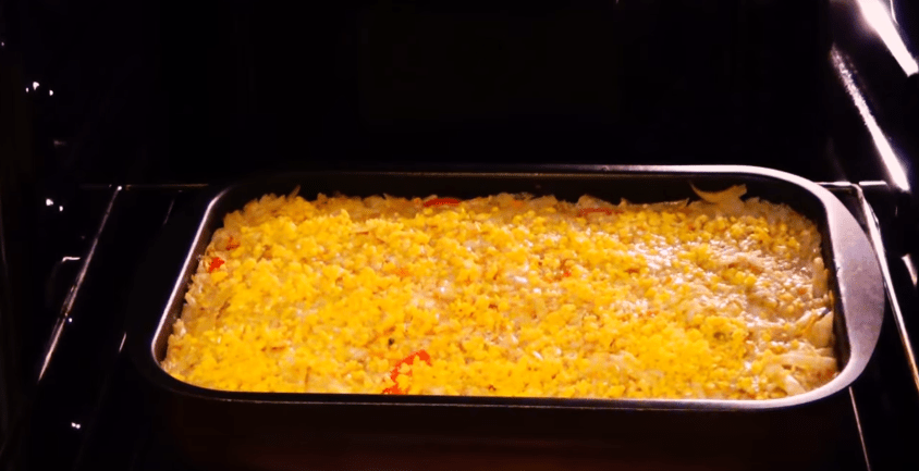 9. Отправляем запеканку в духовку, разогретую до 180 градусов. Чтобы она не пригорела сверху, желательно накрыть ее фольгой. Через 40 минут готовки открываем духовку, убираем фольгу и посыпаем пирог тертым сыром.