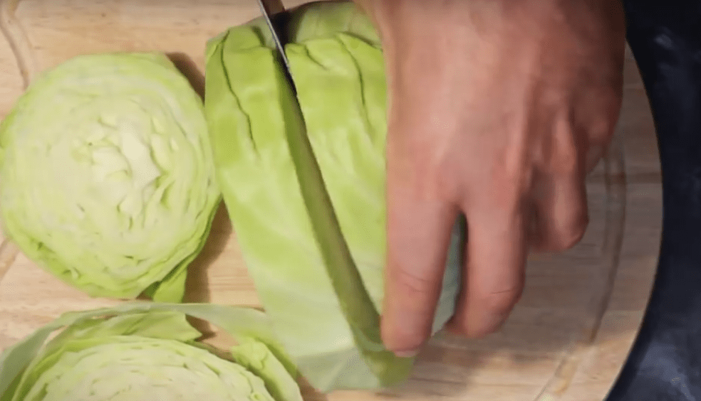 1. Капусту кладем на бок так, чтобы кочерыжка смотрела в сторону и нарезаем кольца толщиной в 2 см.