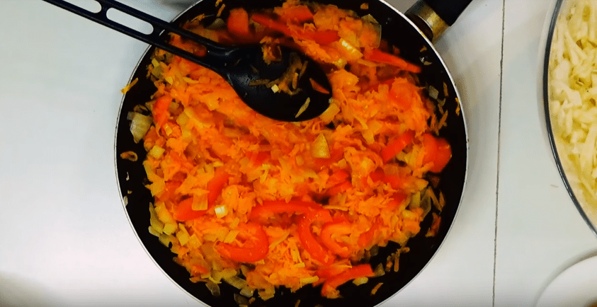 Морковь трем на мелкой терке, капусту мелко шинкуем и обжариваем их вместе на сковороде с растительным маслом до мягкости. На это уйдет около 10-15 минут на среднем огне.