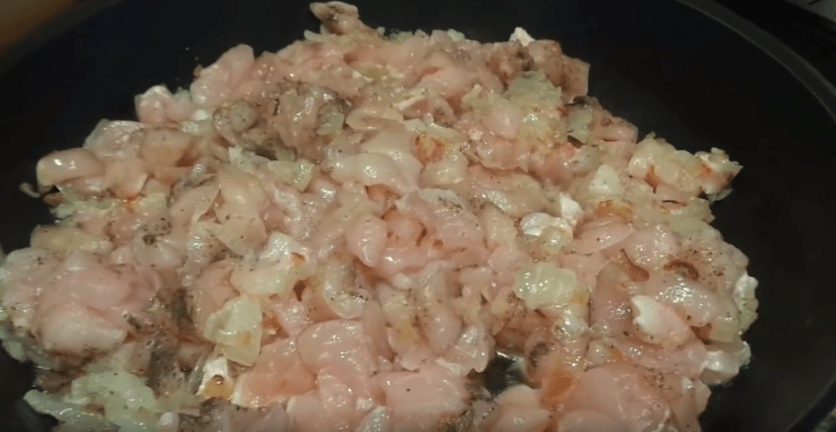 2. Куриное филе нарезаем мелкими кусочками и обжариваем его на другой сковороде вместе с измельченным луком. Здесь времени требуется побольше, мясо должно успеть не только побелеть, но и зазолотиться. На это уйдет около 15-20 минут. Не забываем помешивать.